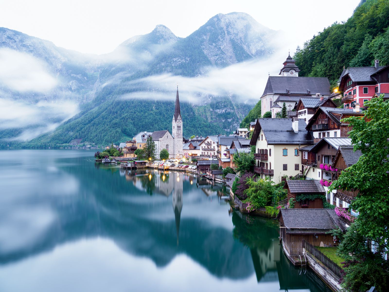 Download 1600x1200 lake, mountains, village, hallstatt, austria wallpaper, background standard 4:3