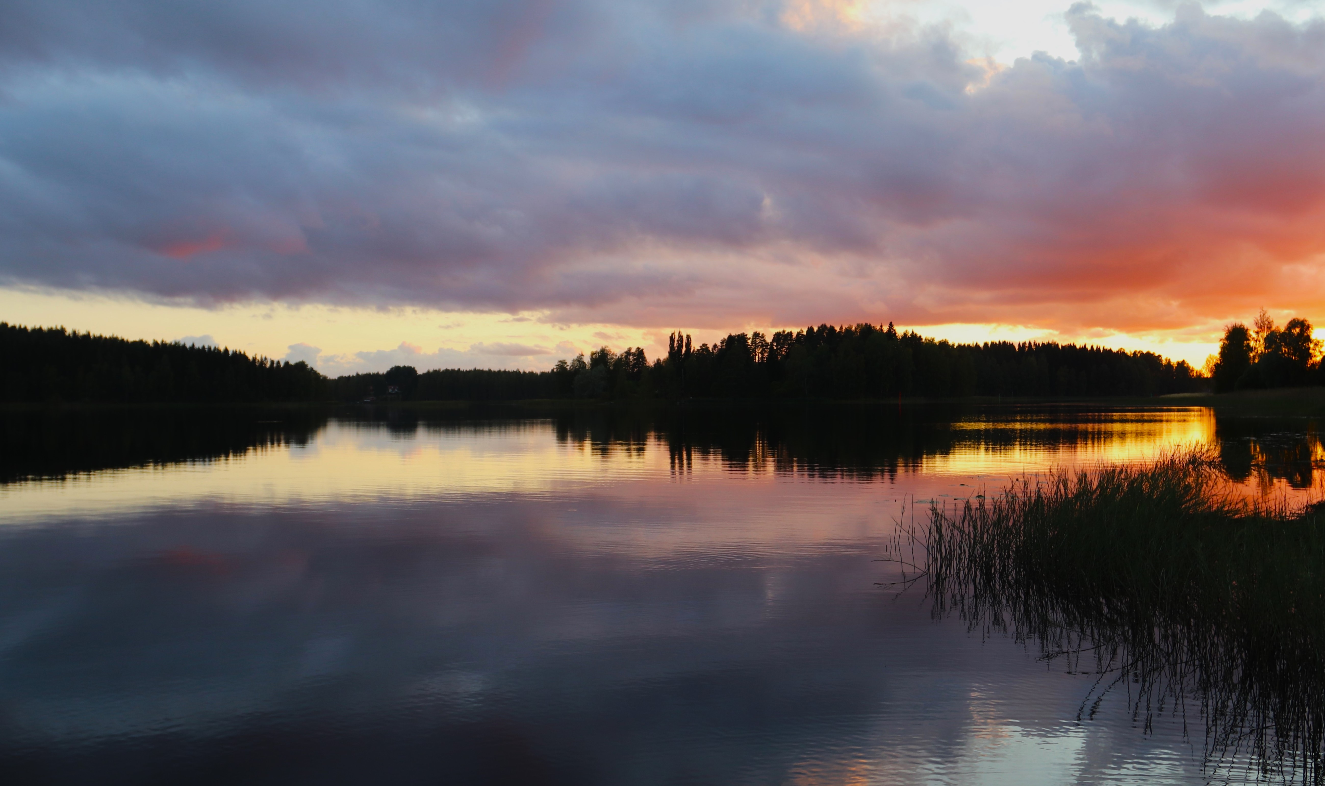 Download 5196x3083 lake, trees, forest, clouds, sky, sunset, landscape, dark wallpaper, background
