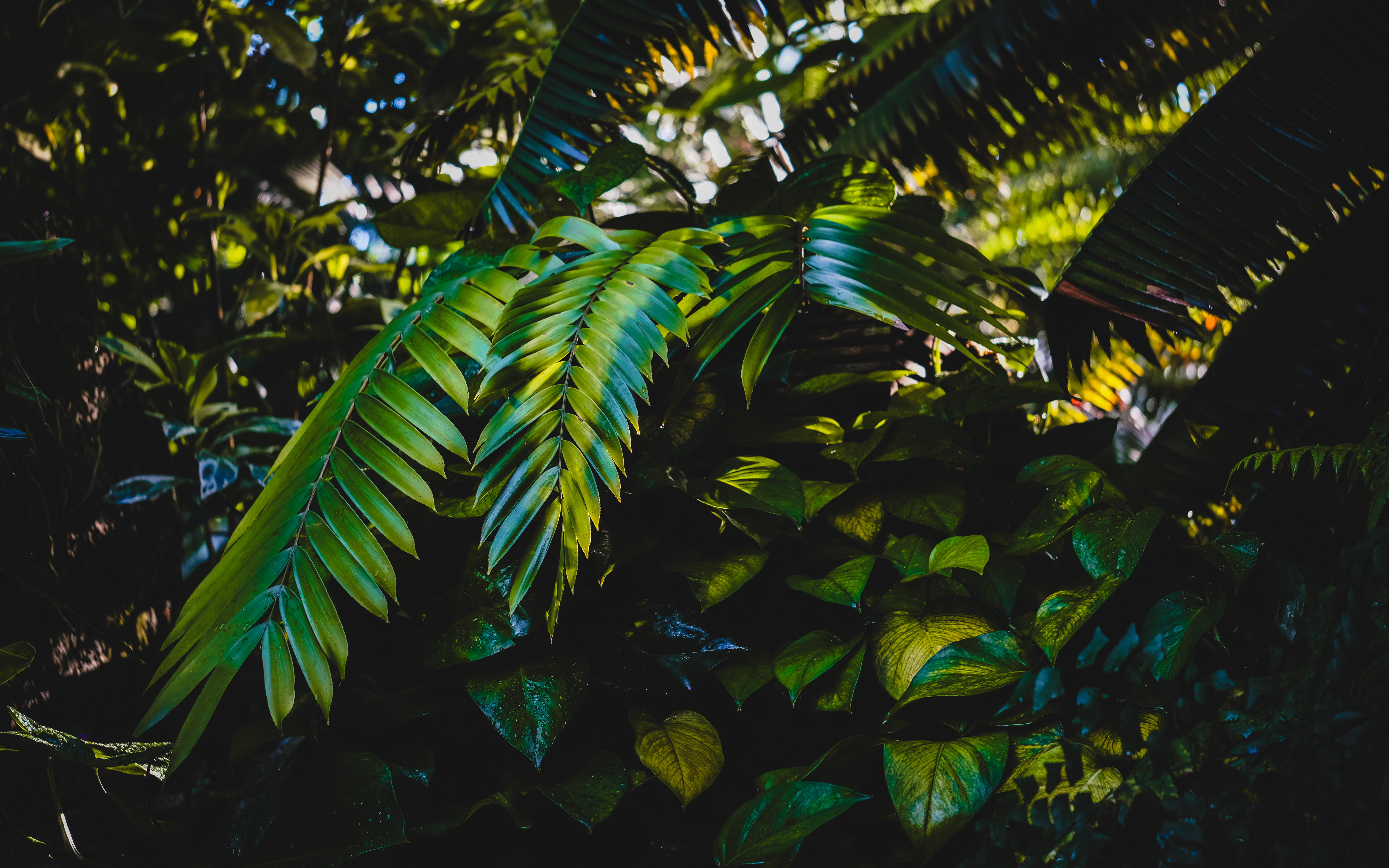 Download 6076x3797 leaves, plants, green, dark wallpaper, background