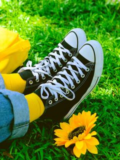 Download 240x320 legs, sneakers, summer, grass, yellow, flower wallpaper, background old mobile, cell phone, smartphone