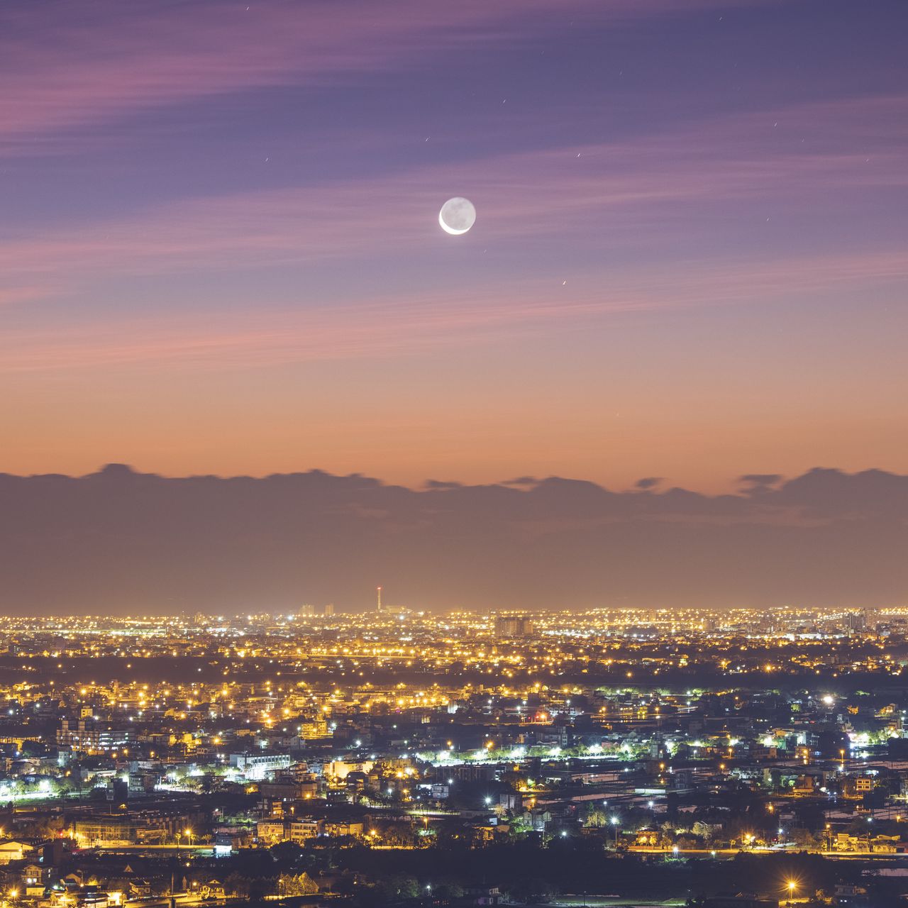 Download 1280x1280 lights, city, buildings, sky, clouds, moon wallpaper, background ipad, ipad 2, ipad mini for parallax
