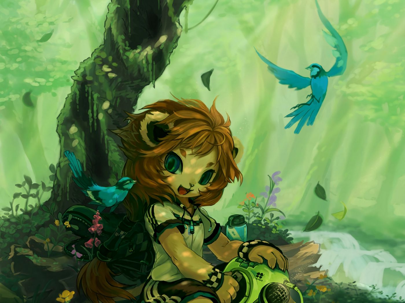 Download 1400x1050 lion cub, art, girl, fantasy, forest, cute, beasts wallpaper, background standard 4:3