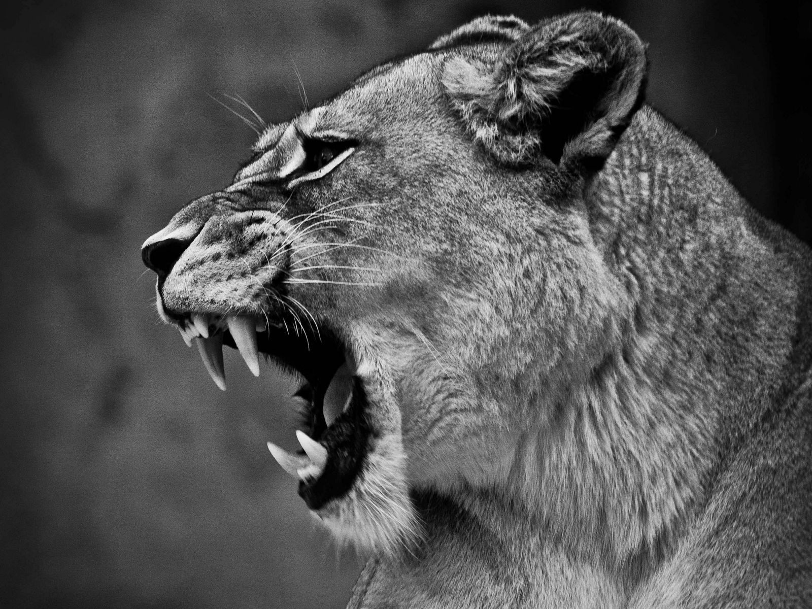 Download 1600x1200 lion, lioness, grin, bw, predator, big cat wallpaper, background standard 4:3