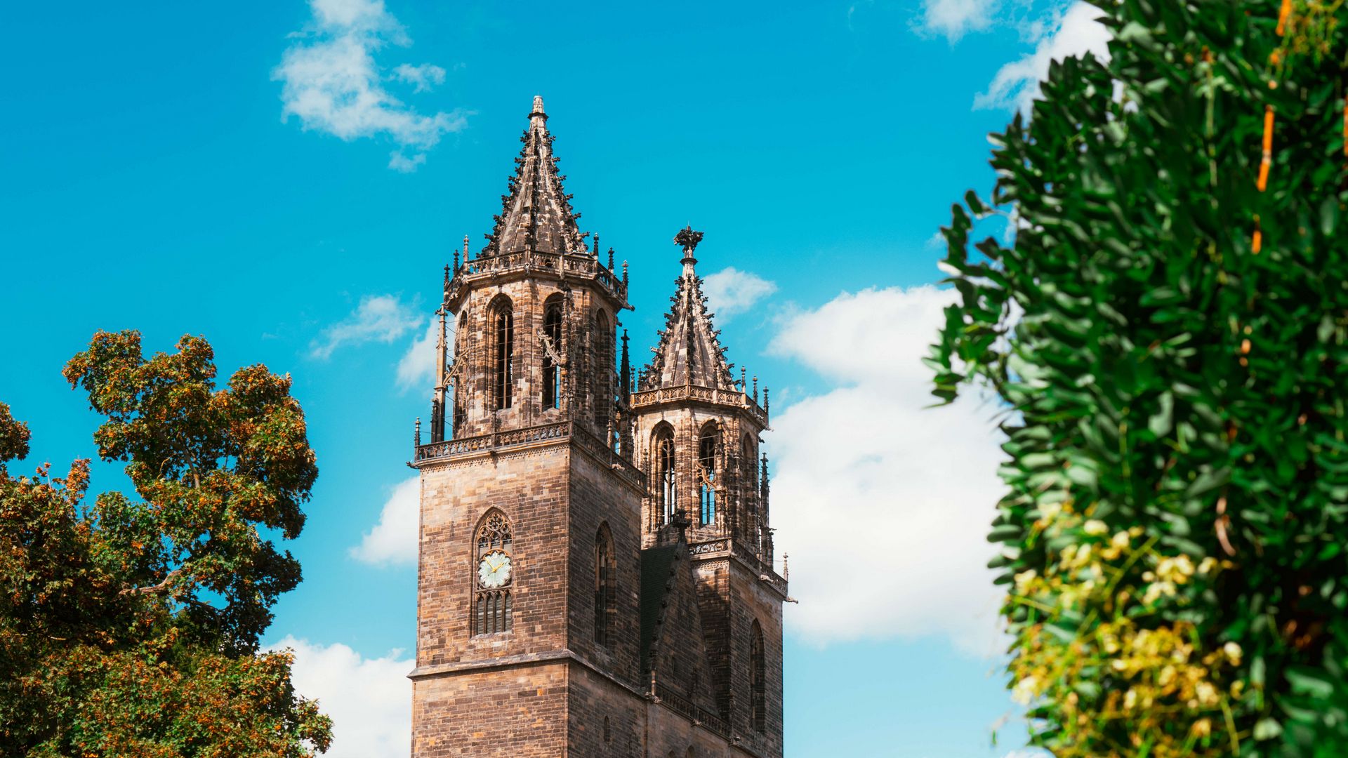 Download 1920x1080 magdeburg cathedral, architecture, building, trees, greenery wallpaper, background full hd, hdtv, fhd, 1080p
