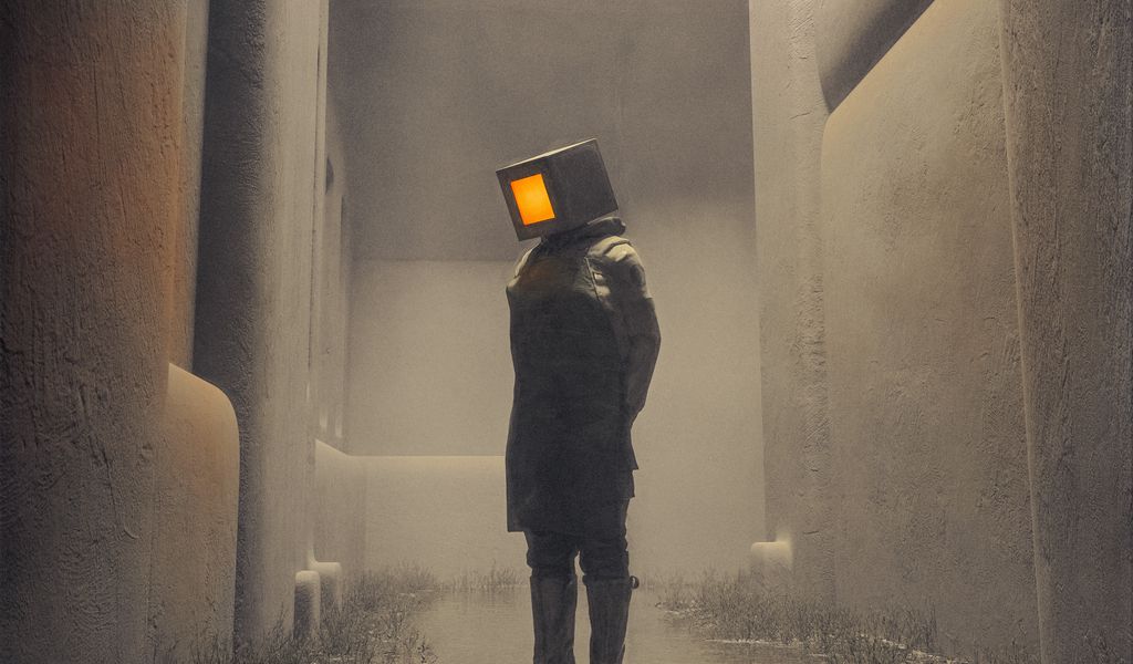 Download 1024x600 man, cube, water, buildings, art wallpaper, background netbook, tablet