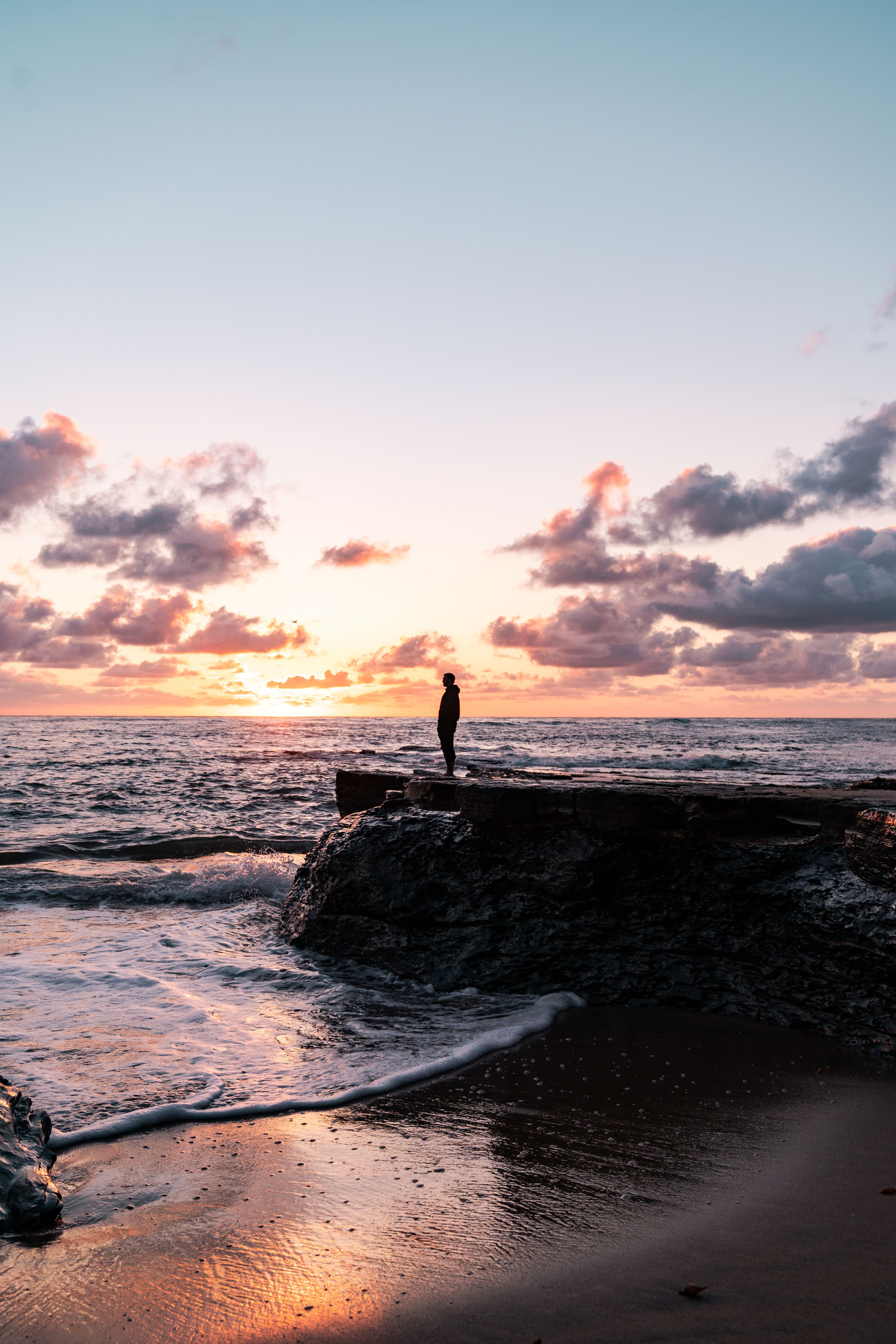 Download 3962x5943 man, silhouette, alone, rock, sea, sunset wallpaper, background
