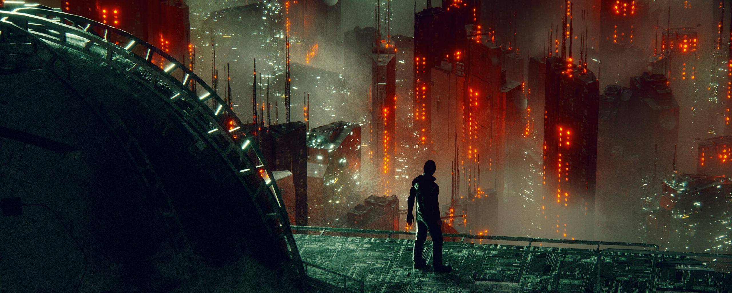Download 2560x1024 man, silhouette, roof, city, art wallpaper, background ultrawide monitor