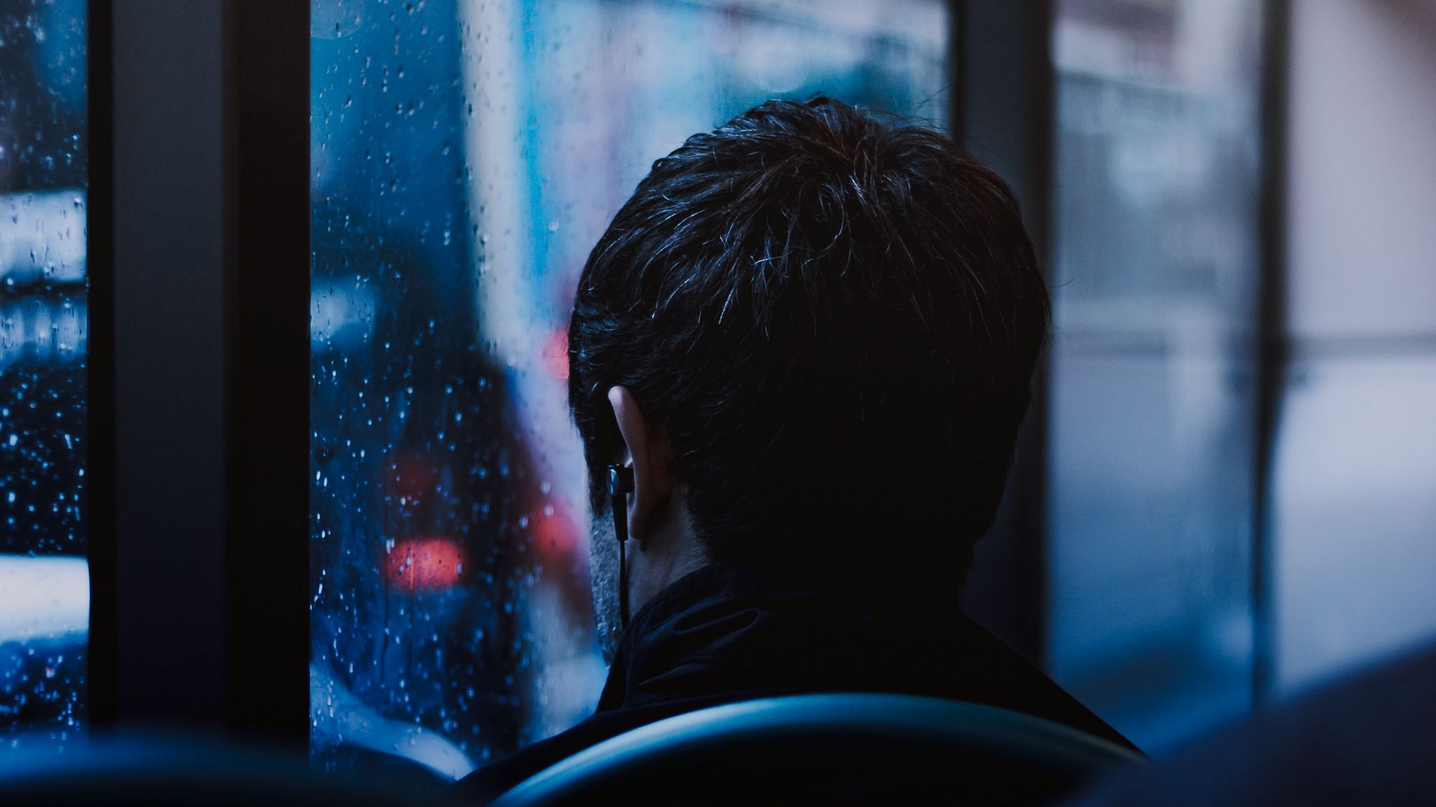 Download 2048x1152 man, window, rain, headphones, melancholy, trip wallpaper, background ultrawide monitor