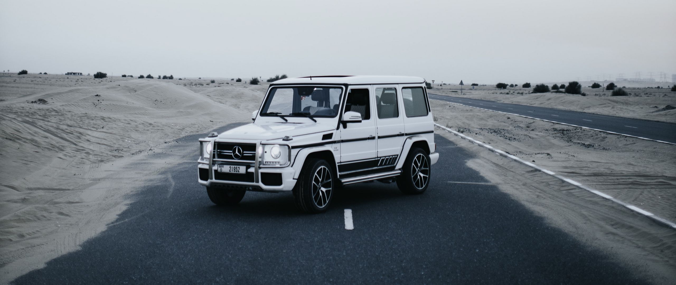 Download 2560x1080 mercedes, car, suv, white, road, desert wallpaper, background dual wide 1080p