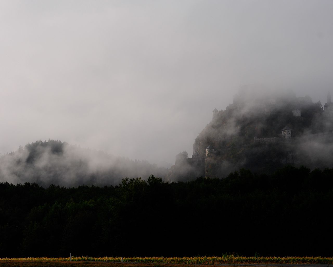 Download 1280x1024 mountain, fortress, fog, forest, nature wallpaper, background standard 5:4