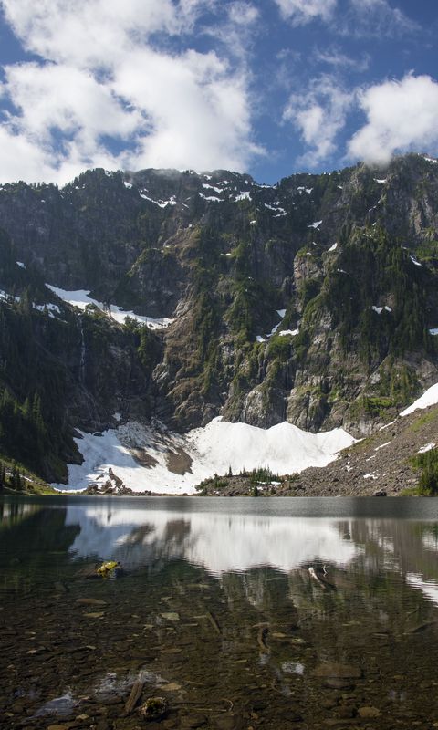 Download 480x800 mountain, snow, river, bottom wallpaper, background nokia x, x2, xl, 520, 620, 820, samsung galaxy star, ace, asus zenfone 4