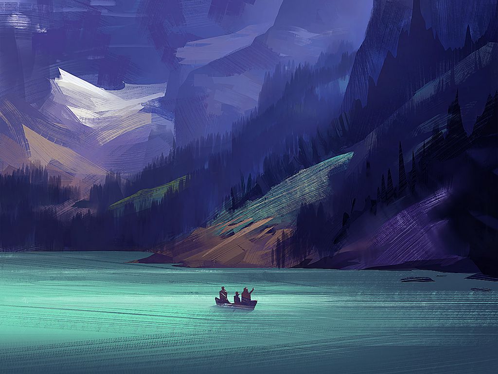 Download 1024x768 mountains, lake, boat, friends, art wallpaper, background standard 4:3
