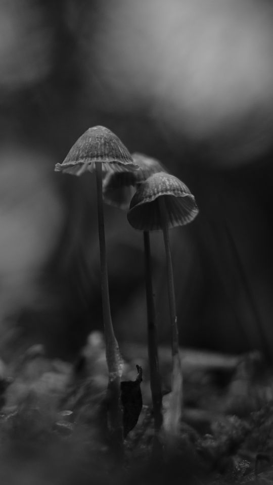 Download 540x960 mushrooms, black and white, macro, moss, blur wallpaper, background samsung galaxy s4 mini, microsoft lumia 535, philips xenium, lg l90, htc sensation