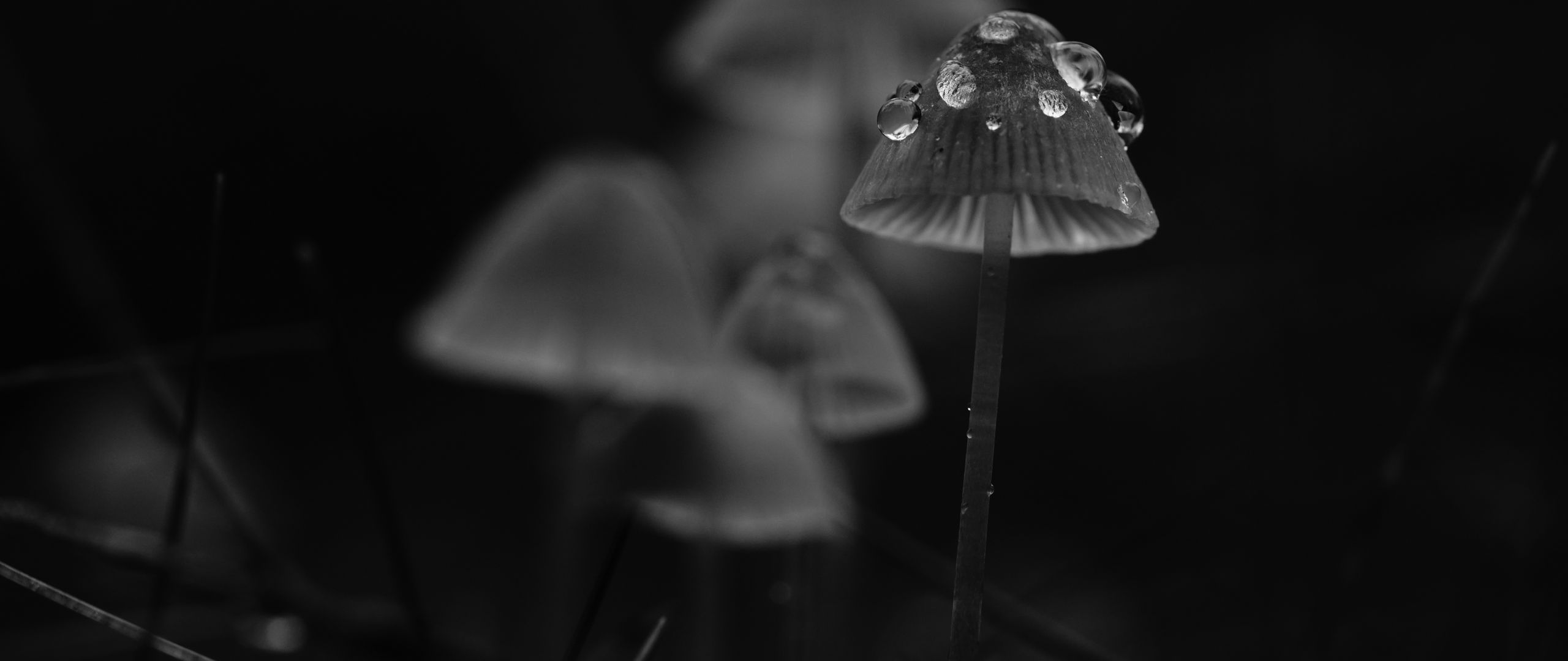 Download 2560x1080 mushrooms, drops, grass, dark, bw wallpaper, background dual wide 1080p