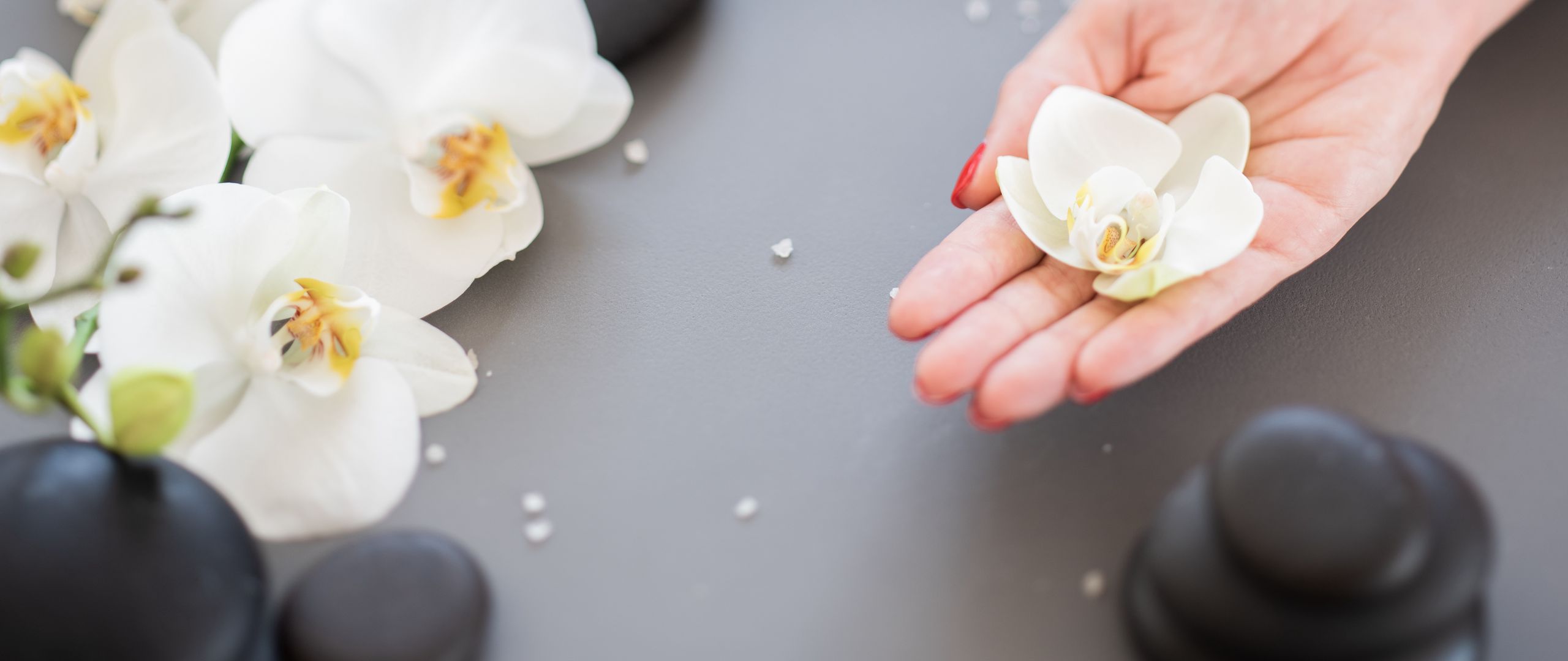 Download 2560x1080 orchid, flower, hand, stone, aesthetics wallpaper, background dual wide 1080p
