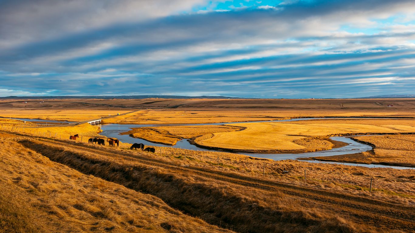 Download 1366x768 pasture, horses, grass wallpaper, background tablet, laptop