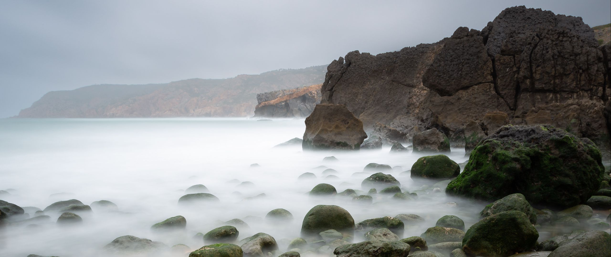 Download 2560x1080 pebbles, stones, sea, fog, rocks wallpaper, background dual wide 1080p