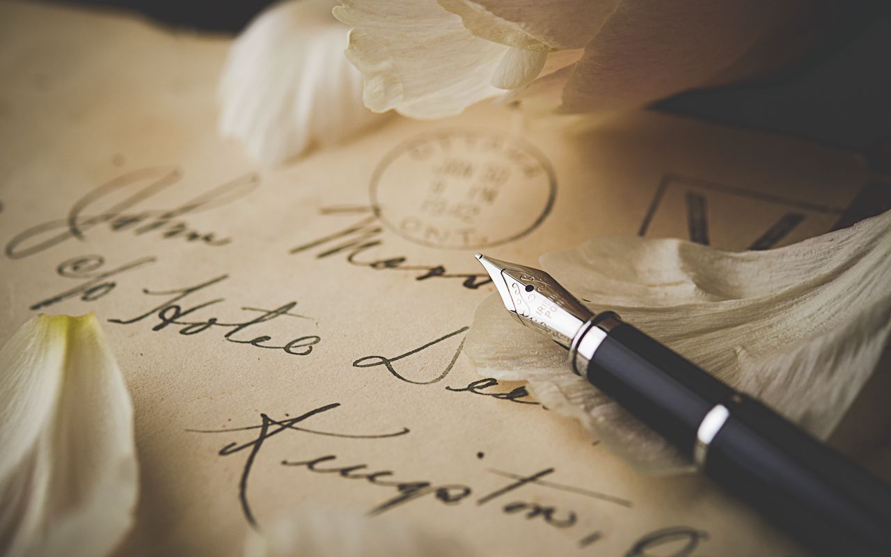 Download 1280x800 pen, letter, petals, envelope, vintage wallpaper, background widescreen 16:10