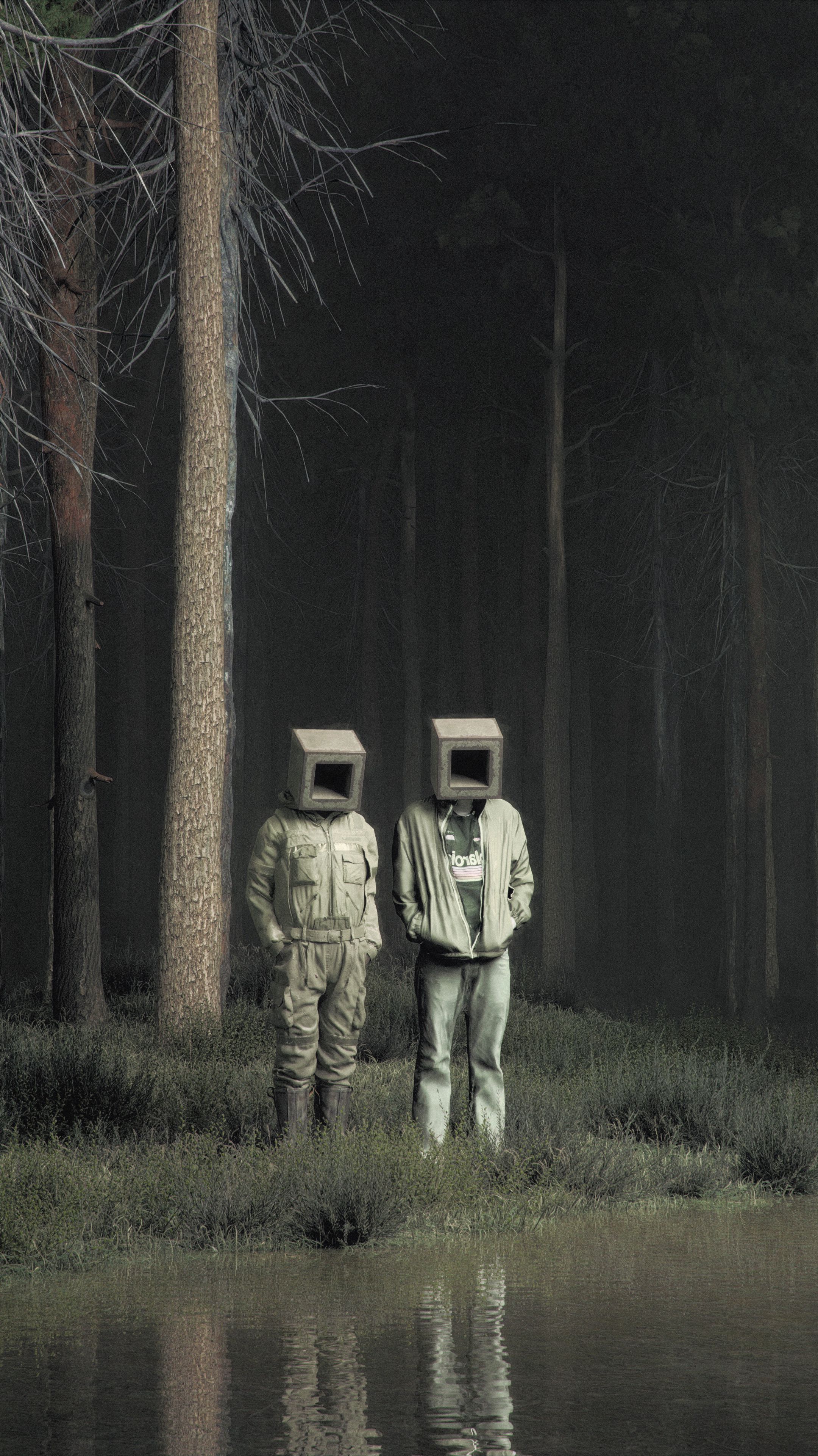 Download 2160x3840 people, cubes, forest, river, art wallpaper, background samsung galaxy s4, s5, note, sony xperia z, z1, z2, z3, htc one, lenovo vibe