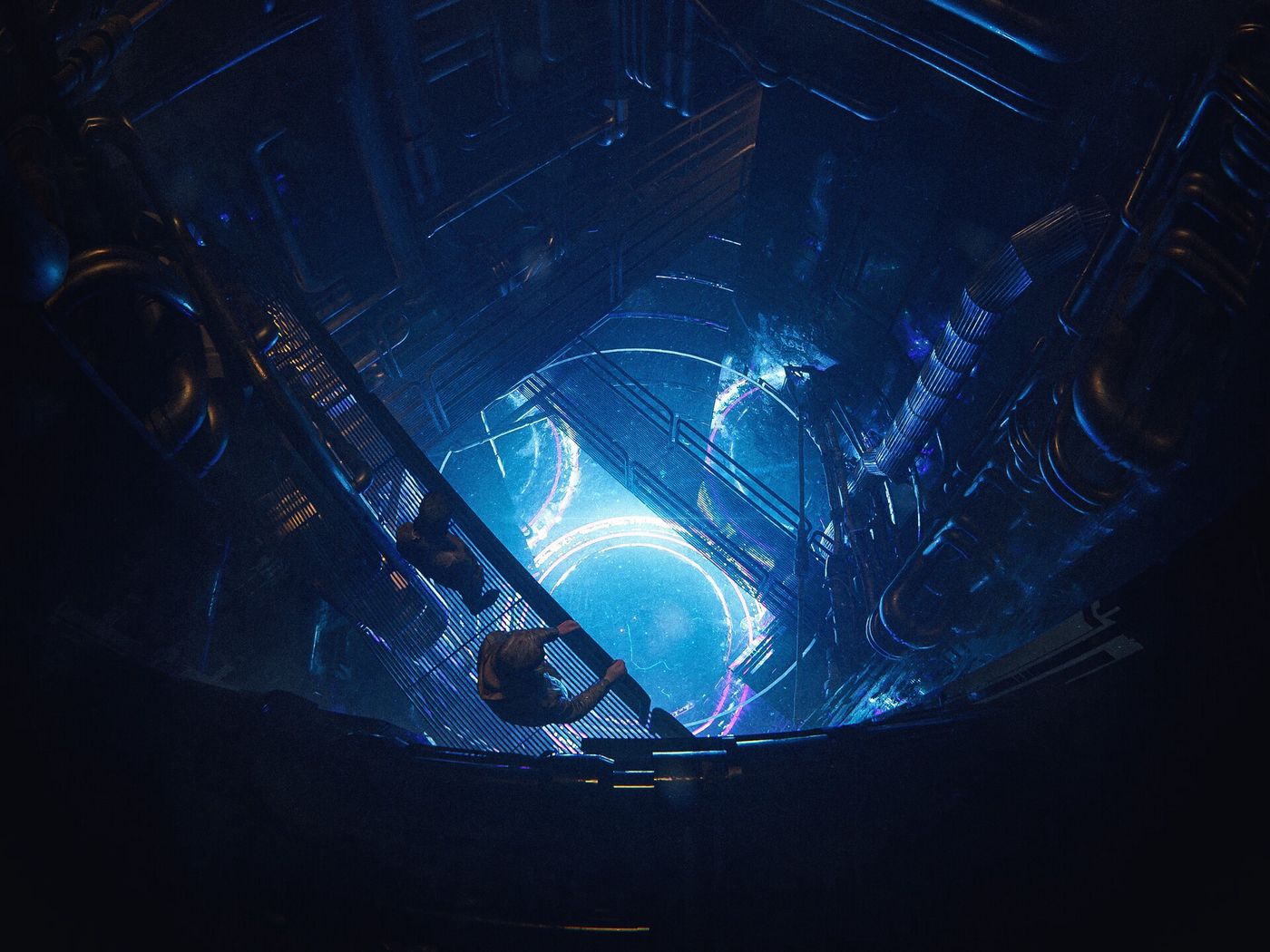 Download 1400x1050 people, silhouettes, reactor, pipes, glow, art wallpaper, background standard 4:3