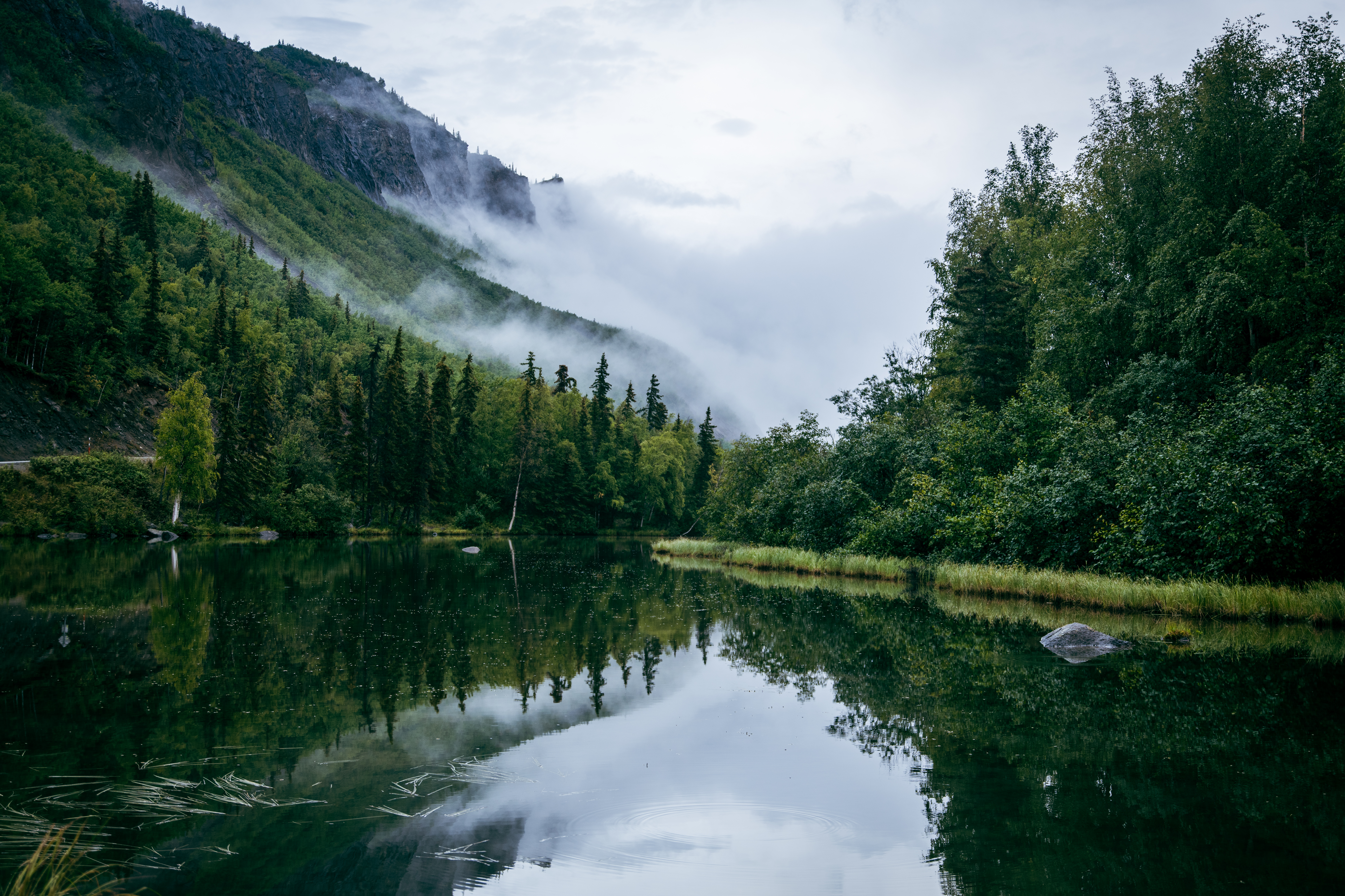 Download 6880x4584 pond, trees, clouds, mountains, landscape wallpaper, background