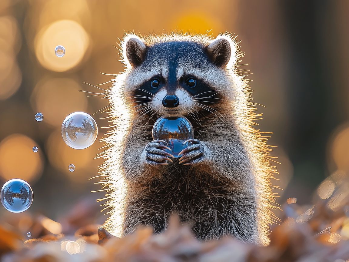 Download 1152x864 raccoon, bubbles, leaves, autumn wallpaper, background standard 4:3