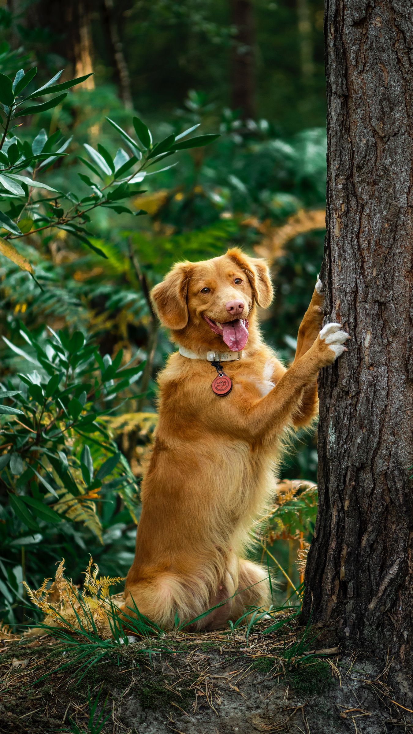 Download 1350x2400 retriever, dog, tongue sticking out, funny, tree wallpaper, background iphone 8+/7+/6s+/6+ for parallax