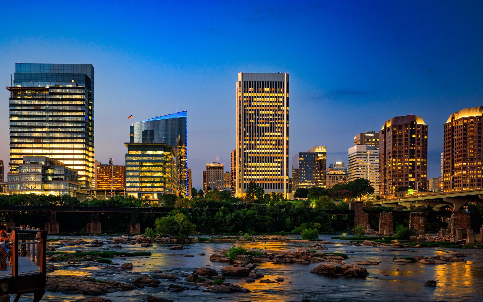 Download 1680x1050 river, city, buildings, light, evening, dark wallpaper, background widescreen 16:10