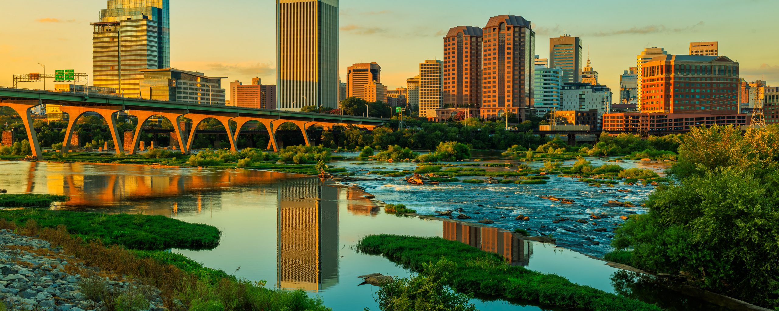 Download 2560x1024 river, greens, bridge, buildings, city, sunset wallpaper, background ultrawide monitor