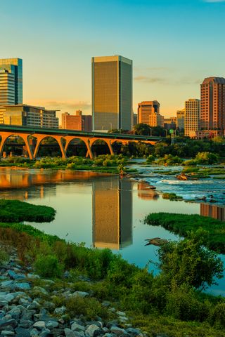 Download 320x480 river, greens, bridge, buildings, city, sunset wallpaper, background samsung galaxy ace gt-s5830, sony xperia e, miro, htc wildfire s, c, lg optimus
