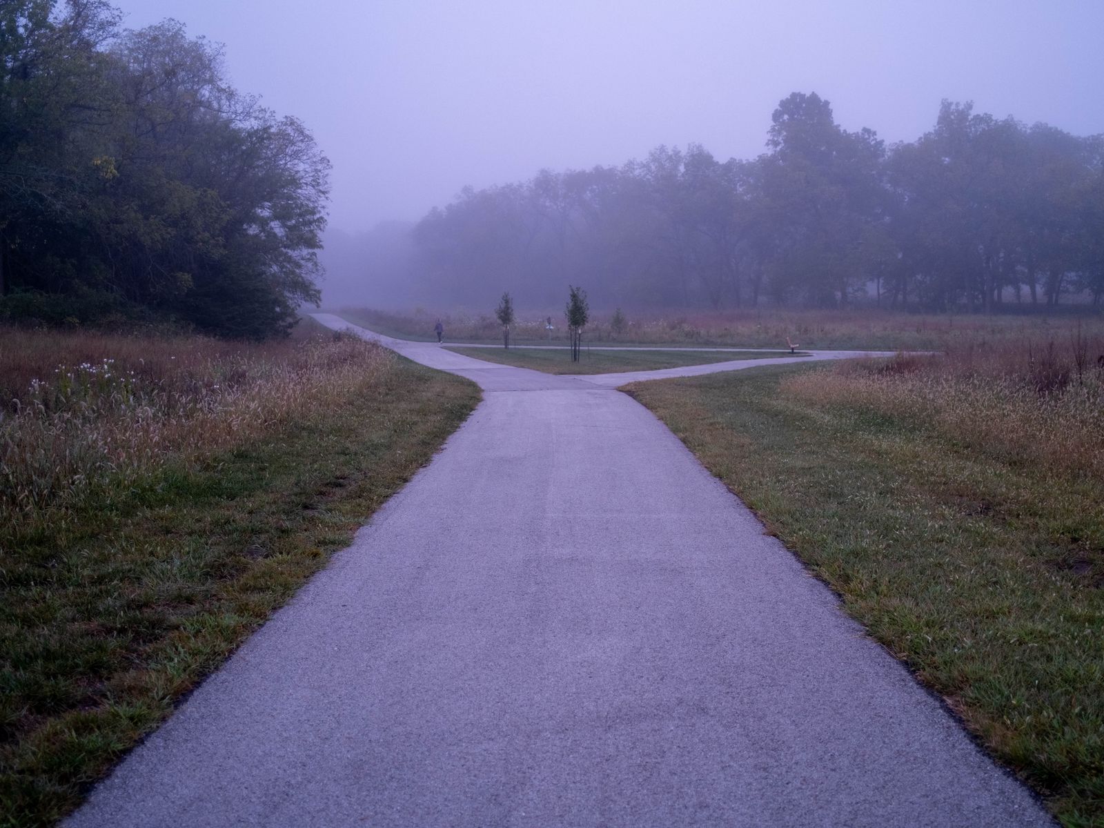 Download 1600x1200 road, asphalt, trees, fog, bushes wallpaper, background standard 4:3