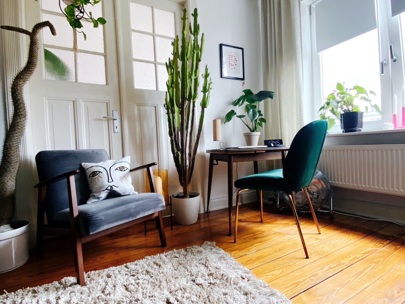 Download 1400x1050 room, interior, armchair, table, houseplant wallpaper, background standard 4:3