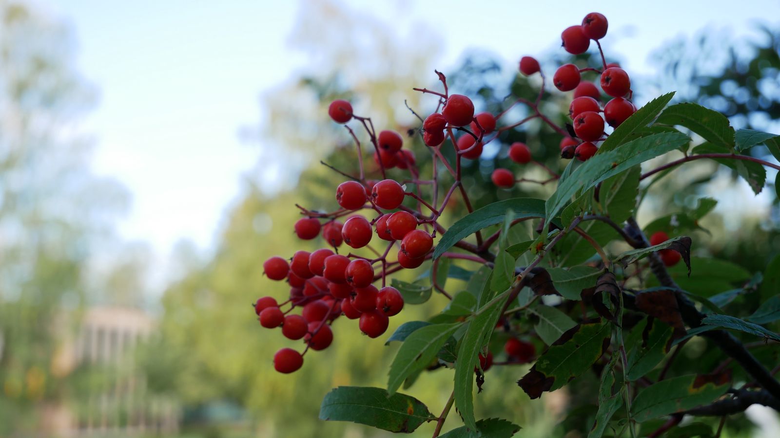 Download 1600x900 rowan, berries, leaves, branches, macro, blur wallpaper, background widescreen 16:9