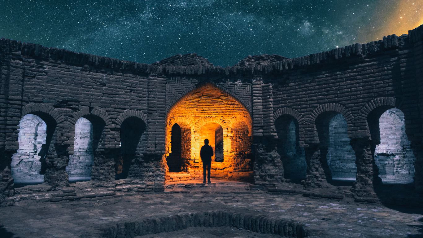 Download 1366x768 ruins, silhouette, starry sky, architecture wallpaper, background tablet, laptop