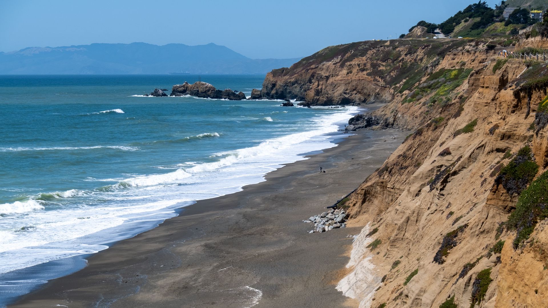 Download 1920x1080 sea, waves, mountain, beach, landscape wallpaper, background full hd, hdtv, fhd, 1080p
