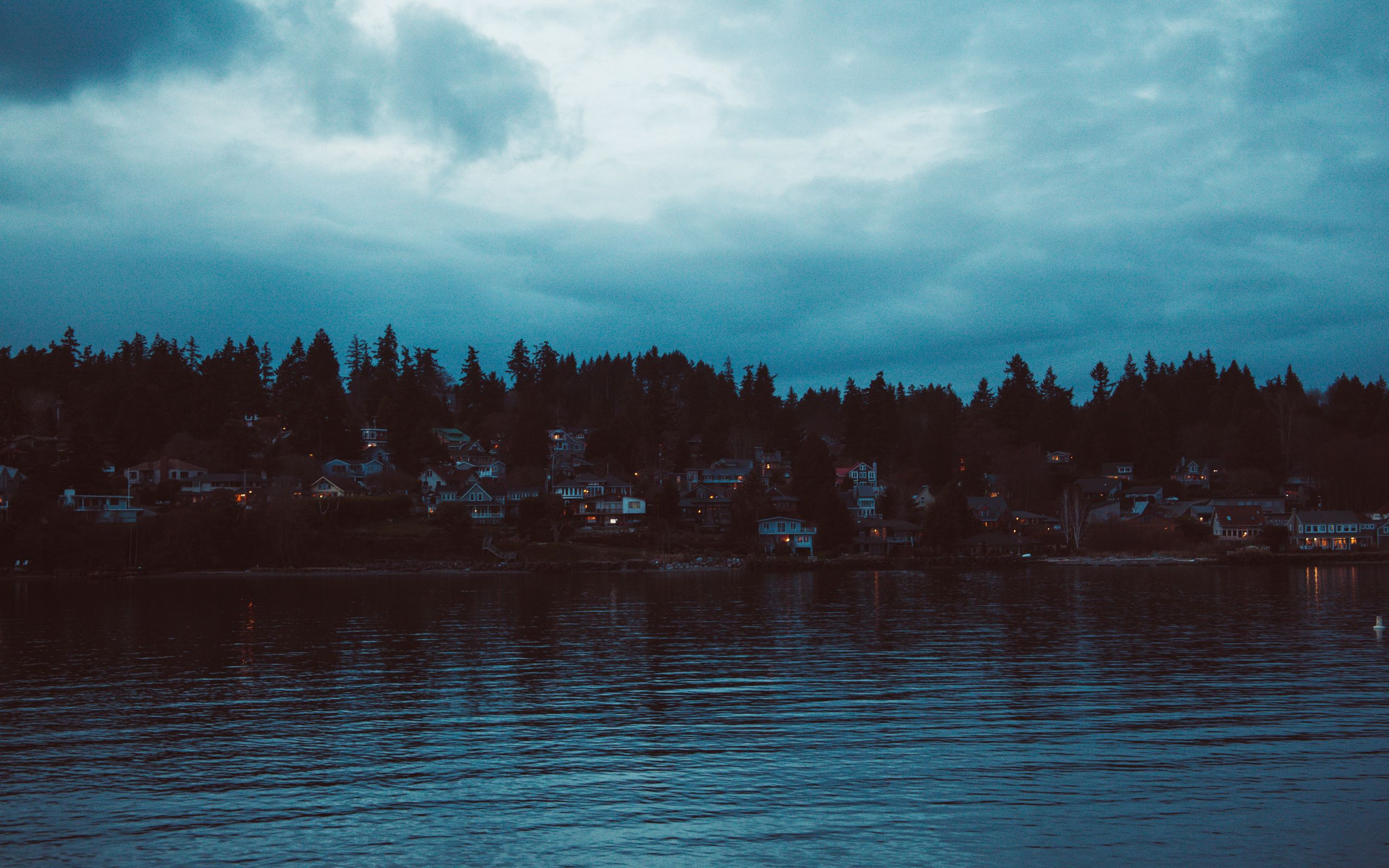 Download 2560x1600 shore, river, home, village, twilight, sunset, sky wallpaper, background widescreen 16:10