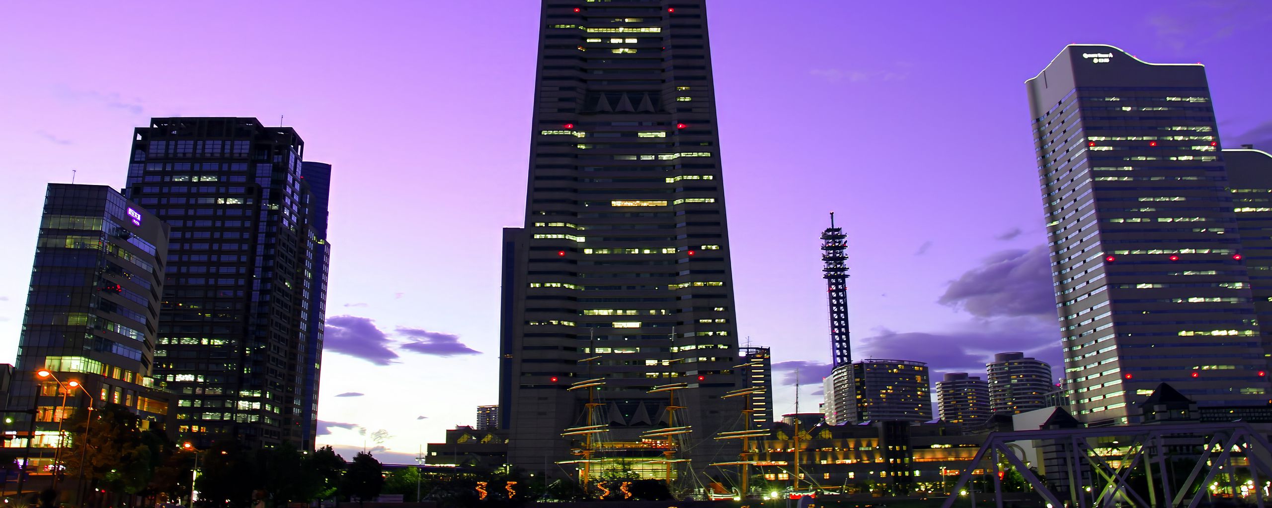 Download 2560x1024 skyscraper, buildings, city, lights, evening wallpaper, background ultrawide monitor
