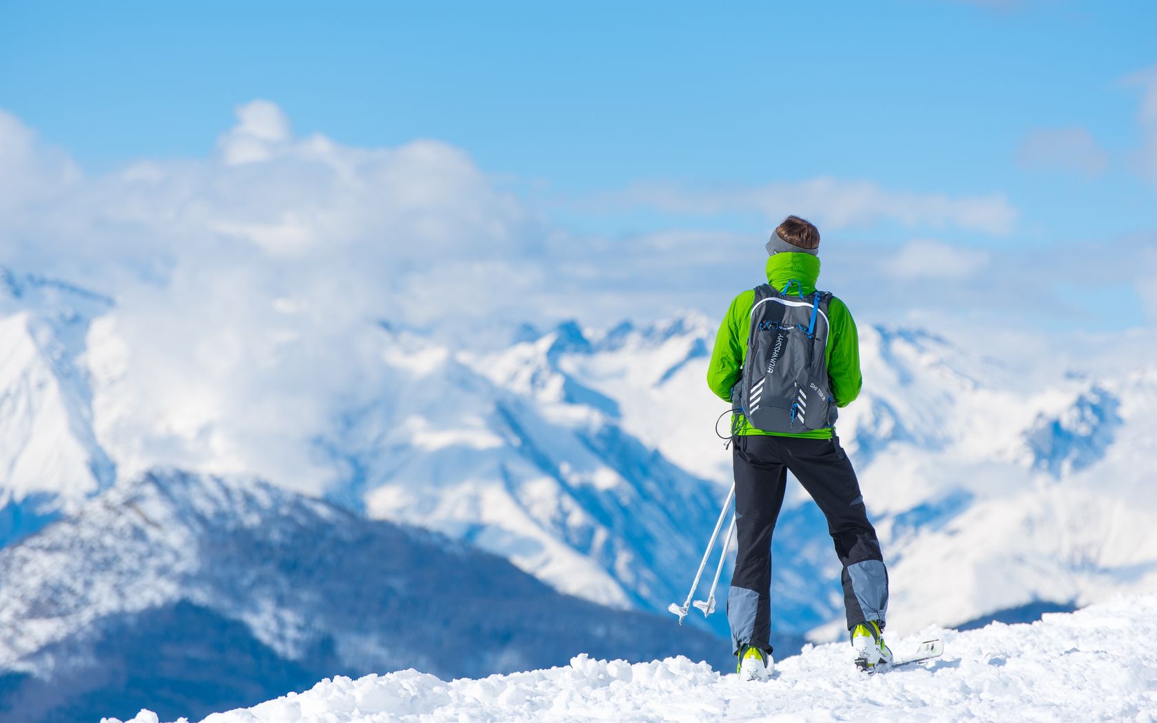 Download 1680x1050 sportsman, skiing, mountain, top, tourist wallpaper, background widescreen 16:10