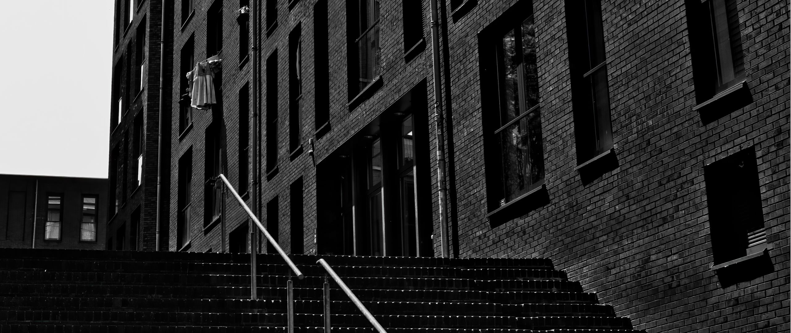 Download 2560x1080 stairs, railings, building, black and white wallpaper, background dual wide 1080p