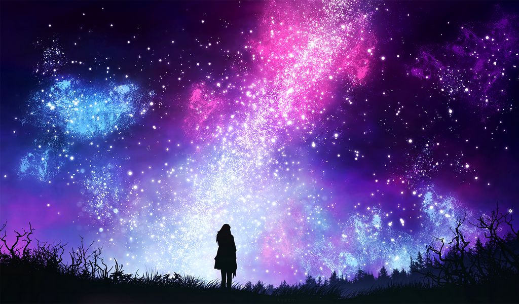 Download 1024x600 starry sky, silhouette, art, shine, brilliant, stars wallpaper, background netbook, tablet
