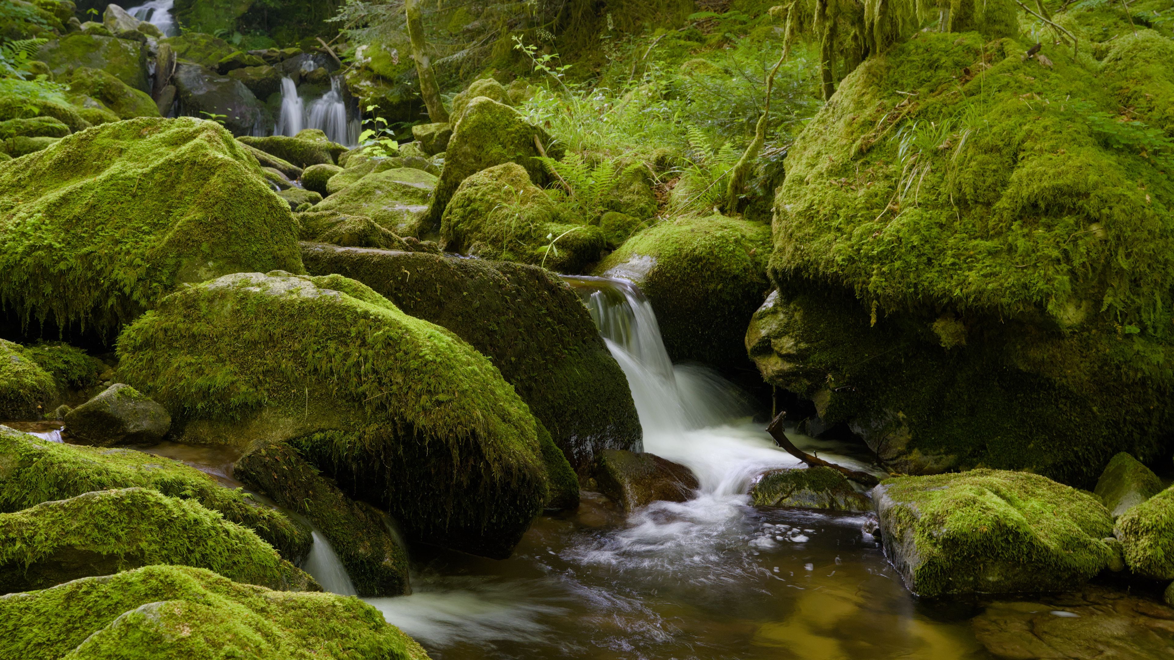 Download 3840x2160 stones, moss, greenery, waterfall, river, nature wallpaper, background 4k uhd 16:9
