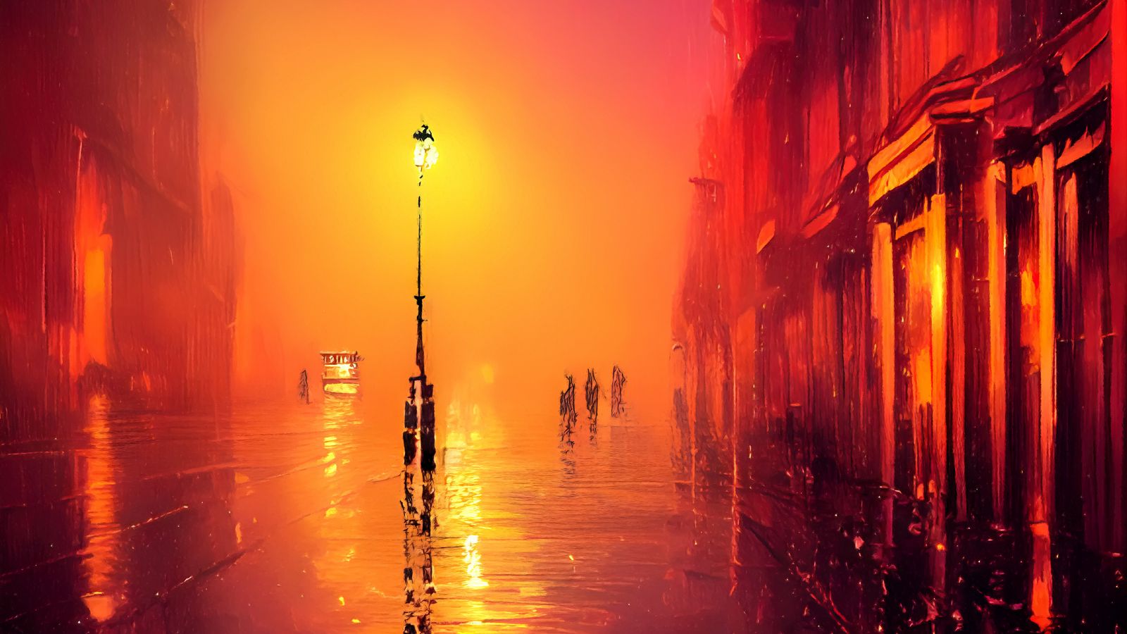 Download 1600x900 street, lamp, light, rain, buildings, art wallpaper, background widescreen 16:9