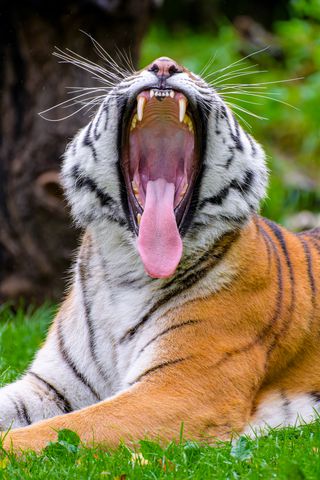 Download 320x480 tiger, grin, protruding tongue, predator, big cat wallpaper, background samsung galaxy ace gt-s5830, sony xperia e, miro, htc wildfire s, c, lg optimus