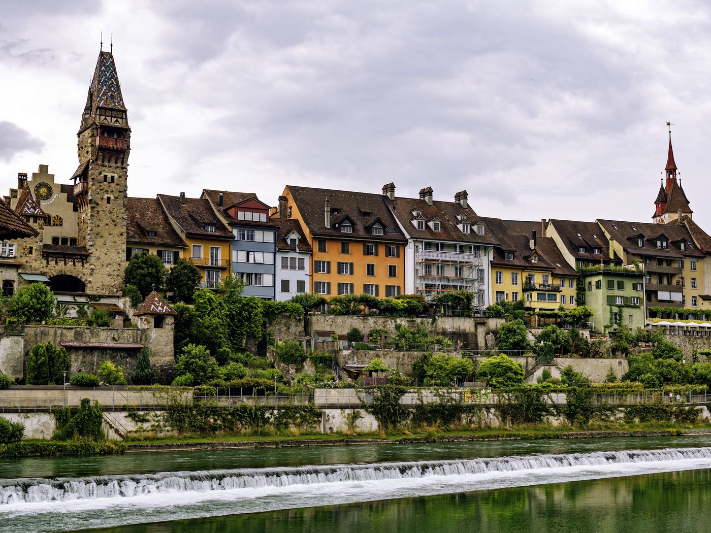 Download 1400x1050 tower, houses, buildings, river, architecture wallpaper, background standard 4:3