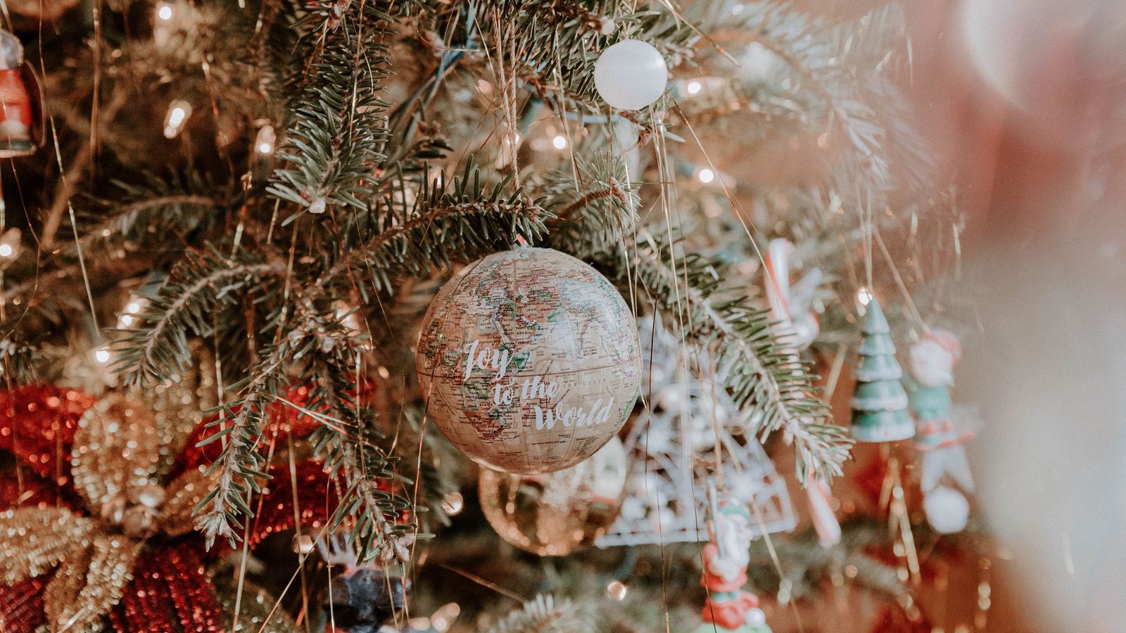 Download 1600x900 tree, decoration, ball, globe, new year wallpaper, background widescreen 16:9