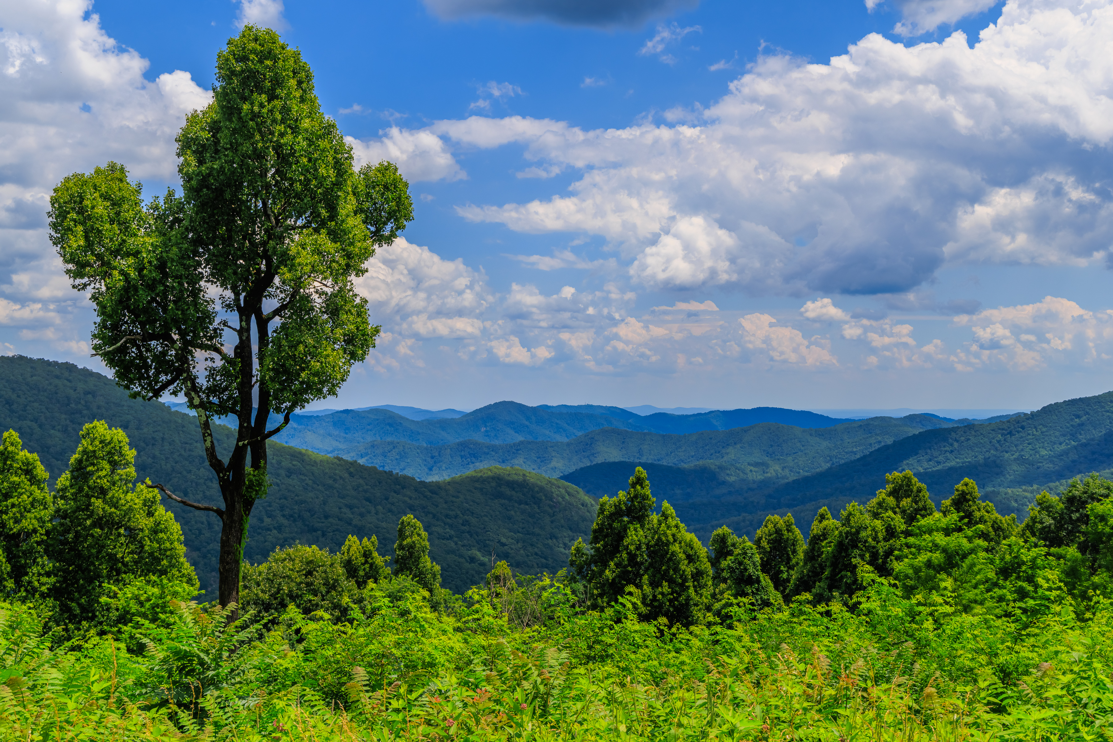 Download 3600x2401 trees, bushes, grass, mountains, clouds, sky, landscape wallpaper, background