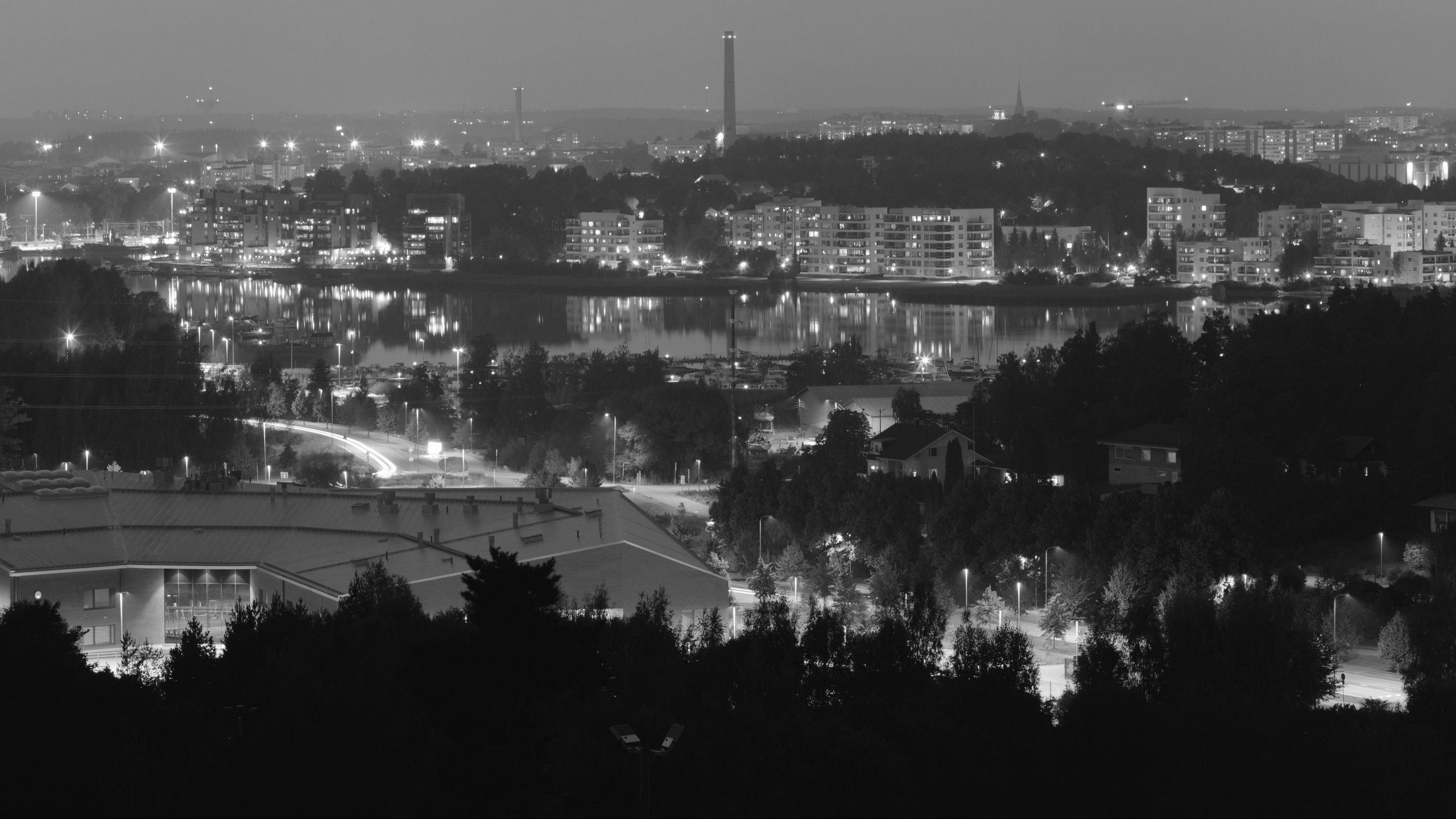 Download 2560x1440 trees, city, buildings, dark, bw wallpaper, background widescreen 16:9