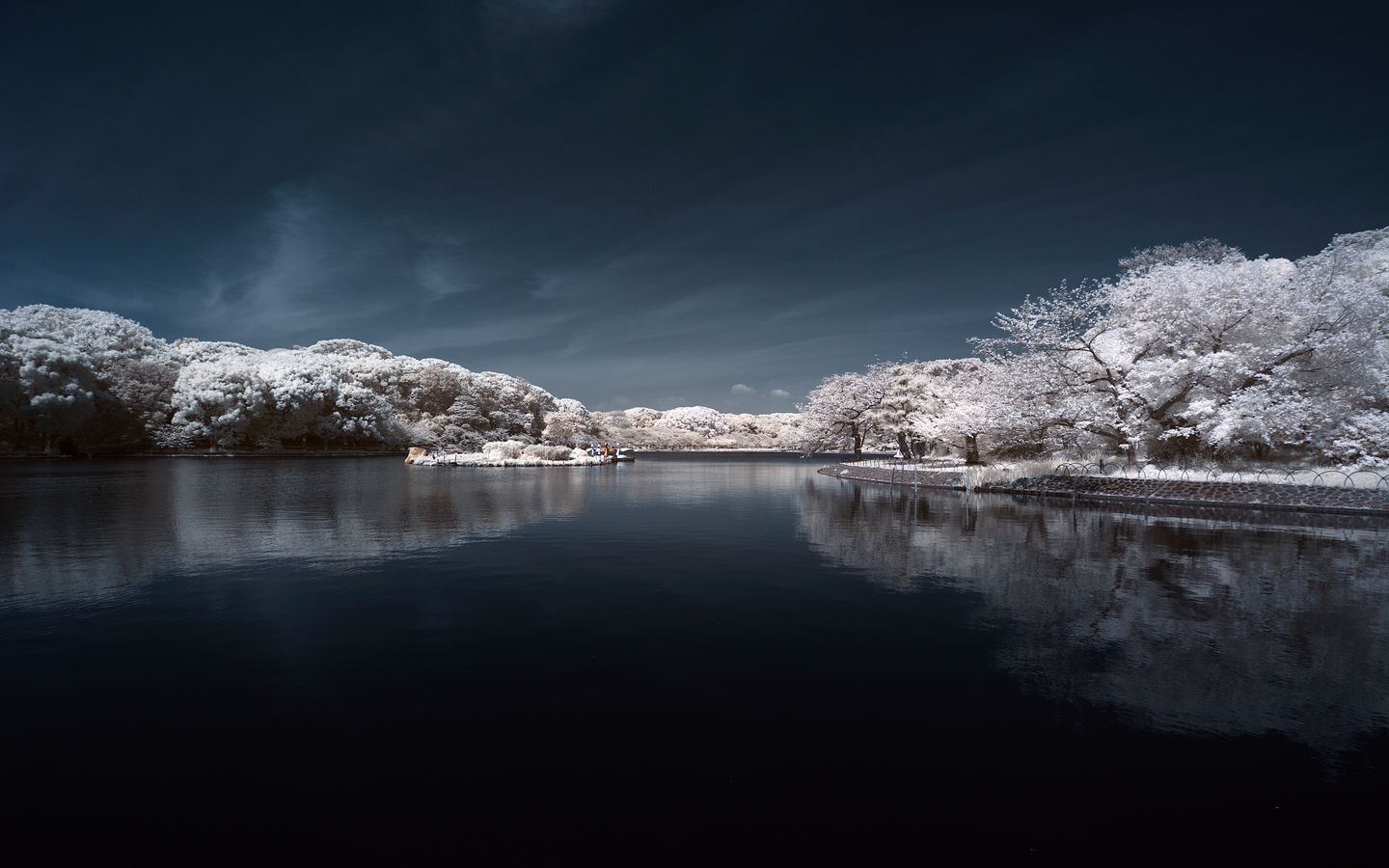 Download 1440x900 trees in snow, water, sky, landscape, nature wallpaper, background widescreen 16:10