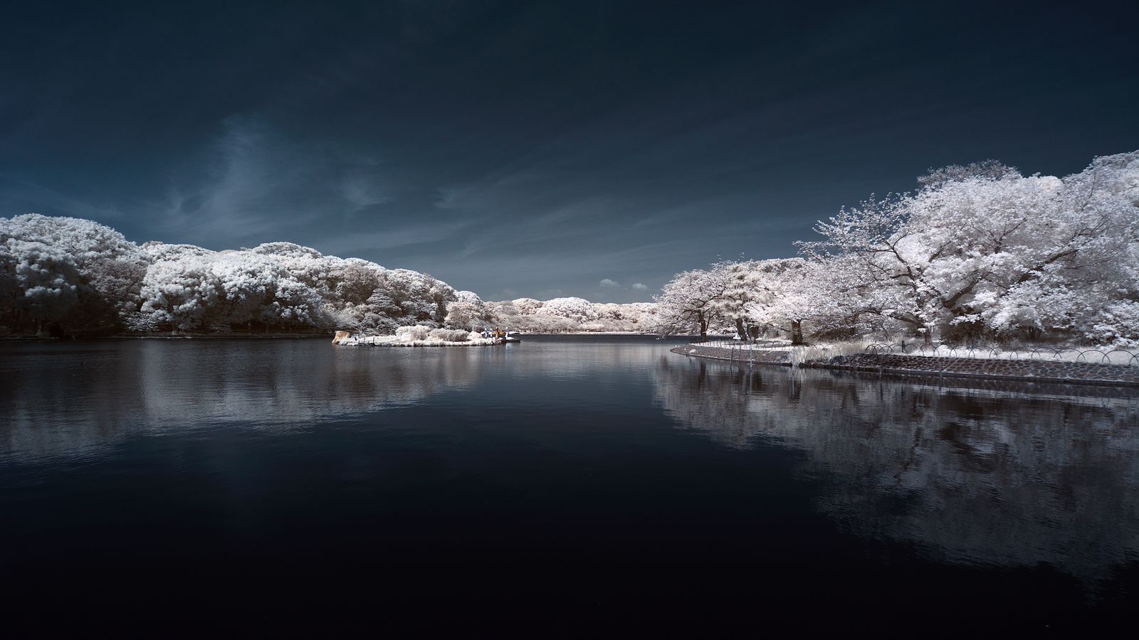 Download 1600x900 trees in snow, water, sky, landscape, nature wallpaper, background widescreen 16:9