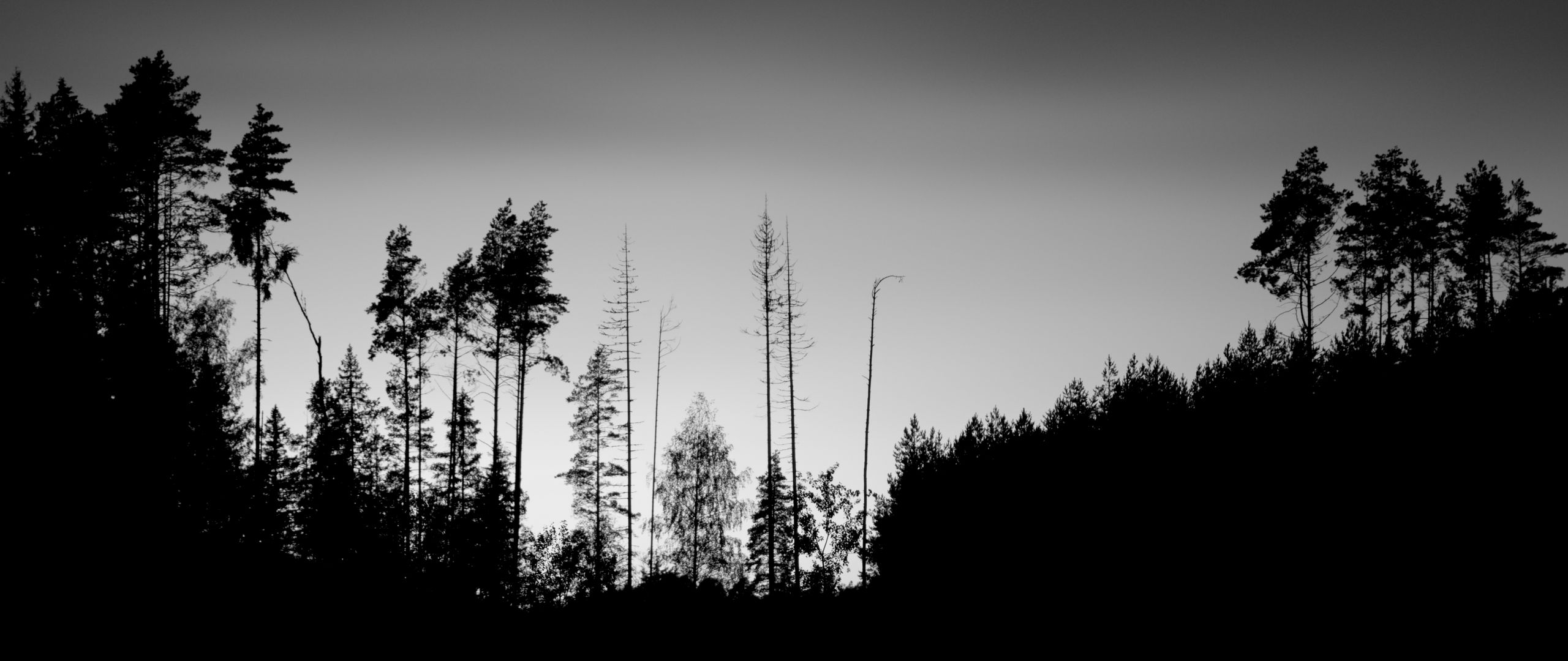 Download 2560x1080 trees, silhouettes, fog, sky, dark, bw wallpaper, background dual wide 1080p